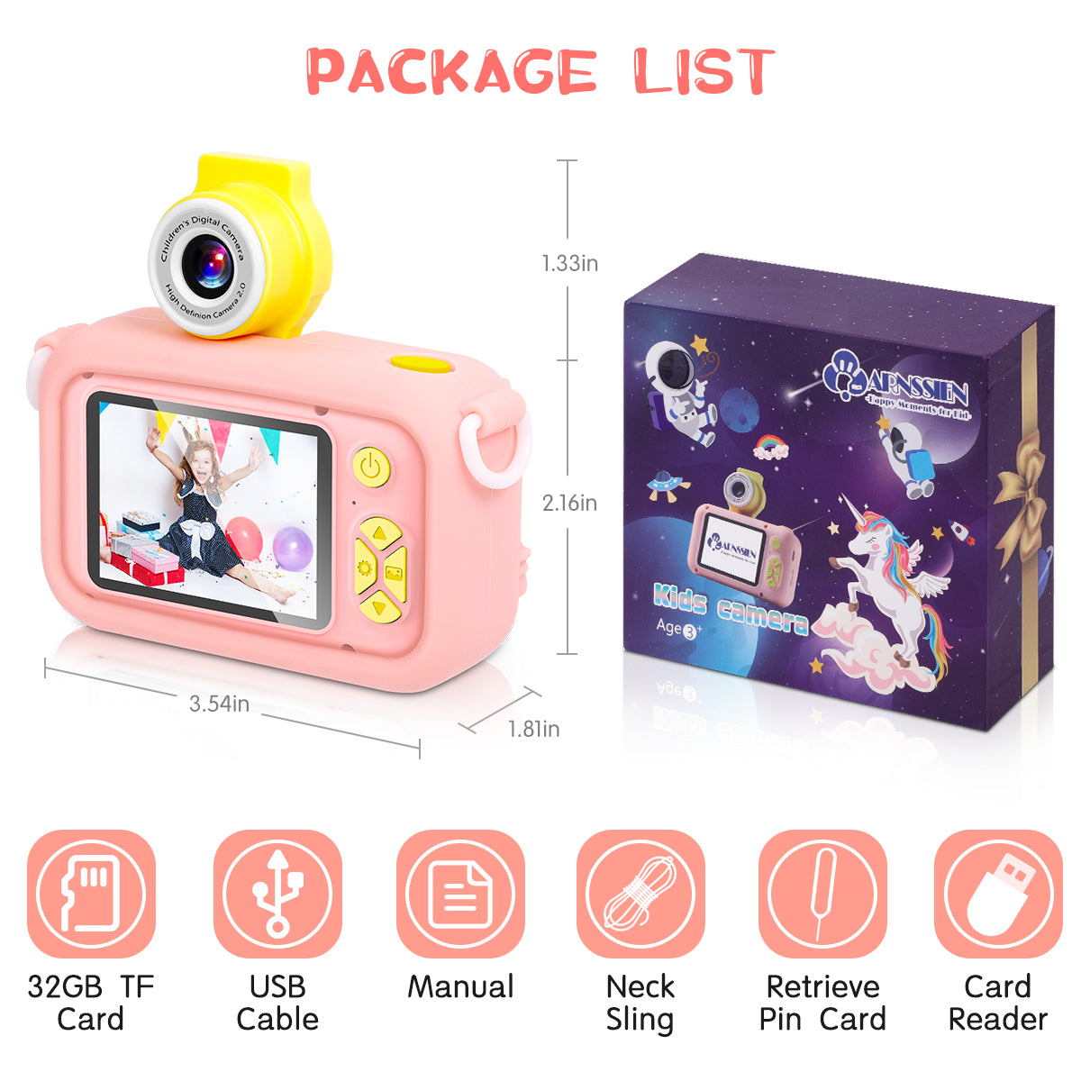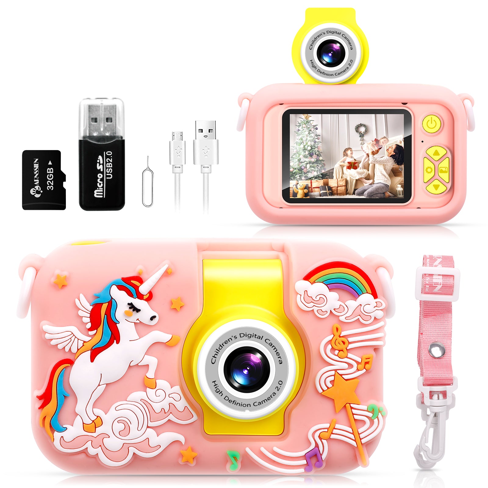 - 📷【Gift Box Packaging&More Delicate Gifts】This kid camera is packaged in a high-grade package, which is a gift carefully prepared. The children couldn't resist their love for unicorn and astronaut. Your child can't wait to open it and can't put down this upgraded children's camera. Package Set: You will receive a delicate kid camera, with a silicone protective case, lanyard, 32GB TF card, card reader, retrieve card pin, and exquisite instructions.